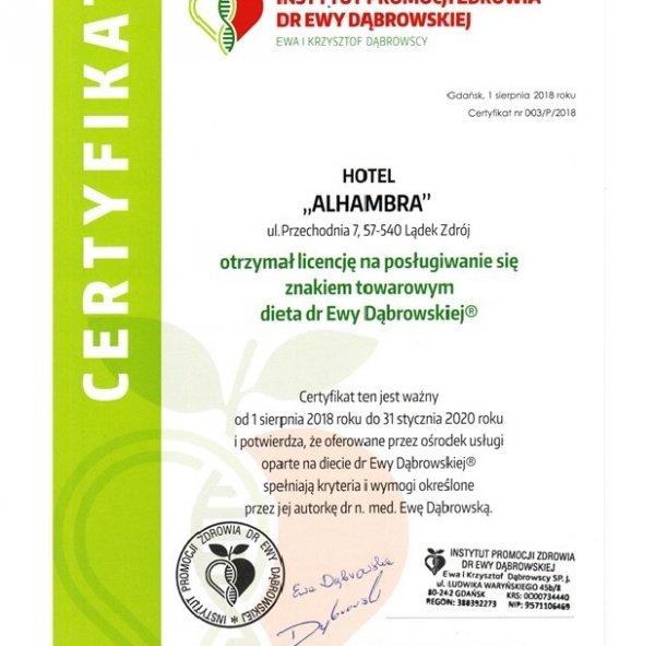 Hotel Alhambra jest pierwszym w Polsce czterogwiazdkowym hotelem, który uzyskał licencje i certyfikat Instytutu Promocji Zdrowia dr Ewy Dąbrowskiej.